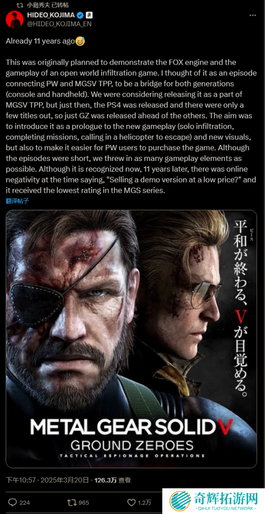 在《合金装备5:原爆点》发售 11 年后,制作人小岛秀夫在社交媒体上回忆了这款游戏发布时获得大量差评的感受。《合金装备》系列是游戏史上最著名的系列之一,也是小岛作为游戏制作人能够脱颖而出的重要作品。系