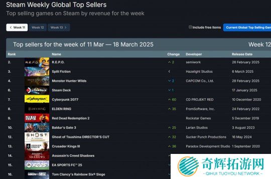 Steam新一周(2025年3月11日--3月18日)销量榜出炉,《怪物猎人:荒野》三连冠被一款名为《R E P O 》的游戏终结,无缘四连冠。3月6日发售的《双影奇境》目前第二,《怪物猎人:荒野》排