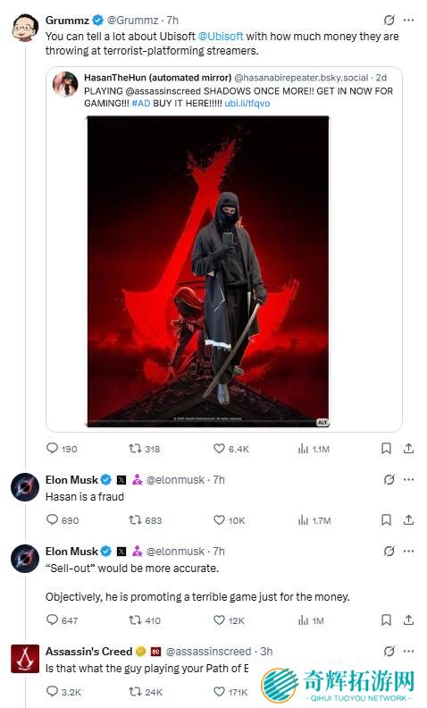 今日,马斯克和育碧这对“老冤家”又在X(原推特)平台上吵起来了。事情的起因是博主Grummz转发了一条游戏博主宣传《刺客信条:影》的推文,并评论道:“从育碧砸钱支持恐怖主义的主播这件事上,你就能看出这
