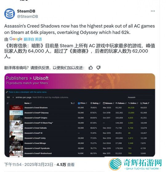 SteamDB官推宣布,《刺客信条:影》Steam在线峰值达到64825人,终于超过2018年游戏《刺客信条:奥德赛》(62069人),正式成为该系列在Steam平台在线峰值最高的一作。此前,育碧官宣
