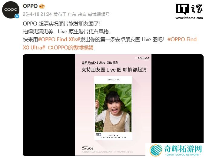 感谢本站网友 OkayTech、软媒新友1933769、風見暉一 的线索投递! 本站 4 月 18 日消息,OPPO 今晚宣布超清实况照片能发朋友圈了,用