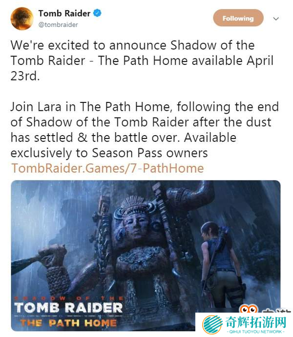 近日,《古墓丽影》的官方推特宣布了《古墓丽影:暗影》最新DLC“THE PATH HOME(回家之路)”的发售日期,并公布了两张宣传图。在这个DLC中,劳拉需要寻找失踪的同伴,并且揭开一个古老的秘密。
