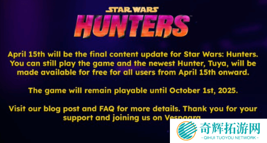发行商Zynga官方宣布,《星球大战:猎人》将于 2025 年 10 月 1 日彻底关停服务器,游戏最后一次内容更新将于 2025 年 4 月 15 日推出。公告原文:“经过慎重考虑,我们决定在 4