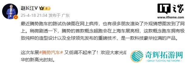 本站 4 月 18 日消息,比亚迪腾势销售事业部总经理赵长江今日发文称,腾势的首款概念超跑会在上海车展亮相,这款概念跑车拥有极致纯粹的造型设计以及全球领先发布的重磅技术,是一款科技豪华拉满的产品。本站