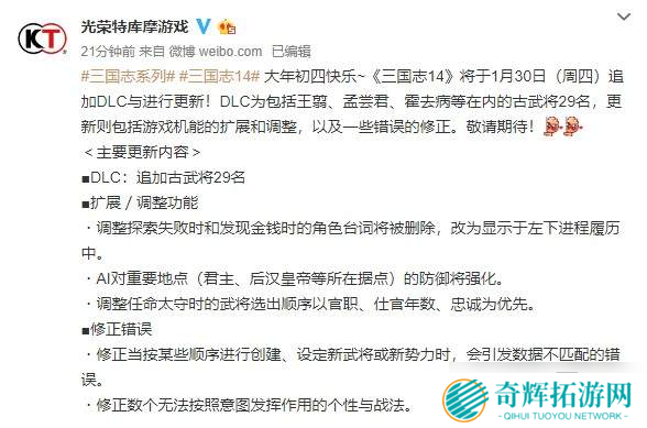 今日,光荣特库摩宣布《三国志14》将于1月30日追加DLC与进行更新。DLC为包括王翦、孟尝君、霍去病等在内的古武将29名,更新包括调整功能和修正错误。 主要更新内容 DLC:追加古武将29名