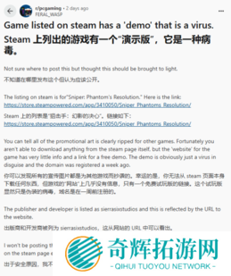 最近,在Steam商店出现了一款恶意软件,伪装成试玩游戏来骗取玩家们的信息。它伪装成一个名为《Sniper Phantom Resolution》的即将发布游戏在Steam页面上出现,并通过开发者链接