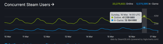 据SteamDB数据显示,Steam平台最高同时在线人数于昨晚(3月16日)突破4100万大关,再次刷新历史纪录。从图片中的图表可以看出,北京时间3月16日22:00,Steam平台同时在线人数达到了