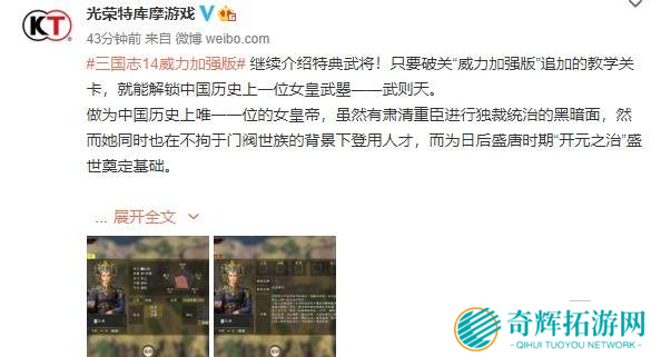 光荣在今日又公布了一位《三国志14 威力加强版》特典武将介绍,本次的主角是中国历史上唯一正统女帝——武曌,即武则天,玩家只要破关“威力加强版”追加的教学关卡,即可拥有这位女帝角色。作为中国历史上唯一一