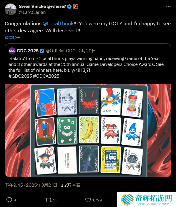 近日,游戏开发者大会 GDC 举办方公布了 2025 年游戏开发者选择奖 GDCA 的获奖名单,其中最高奖项颁发给了去年推出的热门独立扑克牌肉鸽游戏《小丑牌》。在社交媒体上,许多开发者向《小丑牌》献上