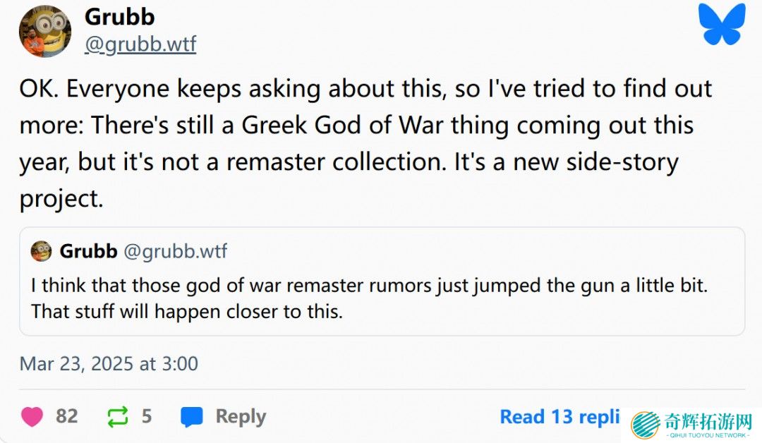 知名游戏记者Jeff Grubb今日发推,爆料PlayStation打算在今年发售一个新的《战神》游戏,讲述的是希腊战神故事,这是一个新的支线故事项目。他同时否认了《战神》老三部曲复刻,这个传闻至少已