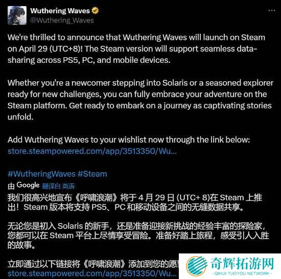 《鸣潮》官方发推文宣布,将于4月29日登陆Steam平台。Steam版支持和PS5、PC、手机 平板跨平台互通,相同服务器的角色进度可以无缝继承。略显遗憾的是,《鸣潮》在Steam上锁国区,也就是说仅