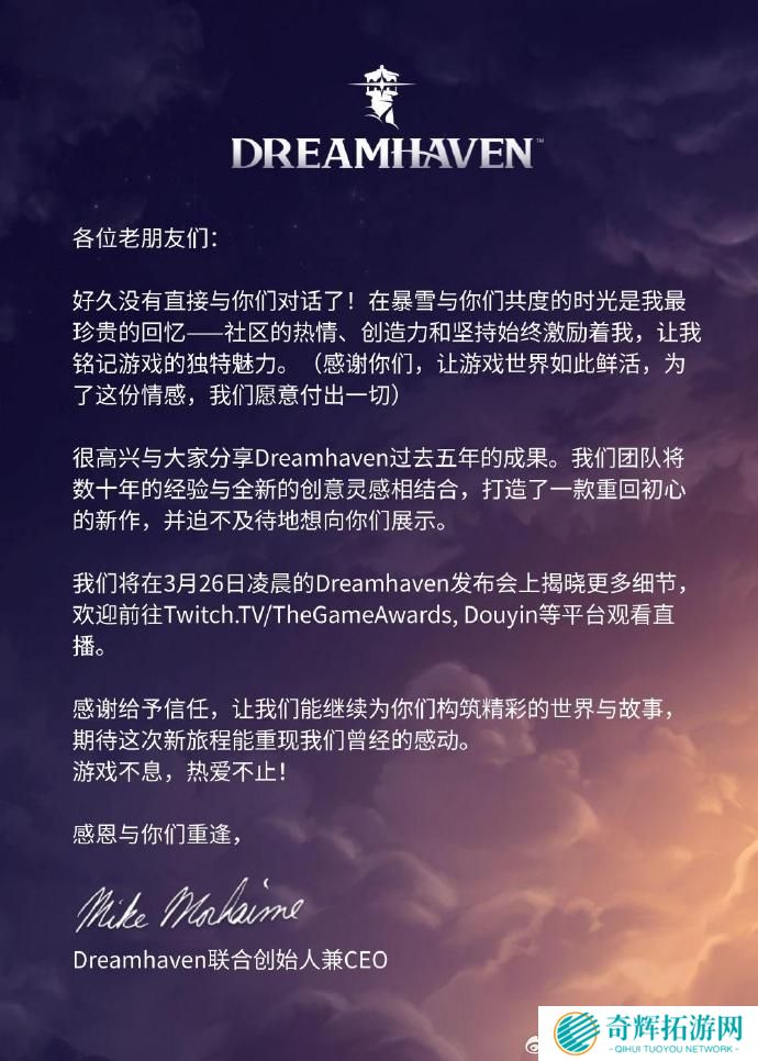 昨天,暴雪联合创始人之一老麦(Mike Morhaime)入驻了国内社交媒体微博,发布了首条消息。老麦表示,他的新公司Dreamhaven全新作品即将揭晓,自己也会在本月底来中国,为中国玩家带来“历史