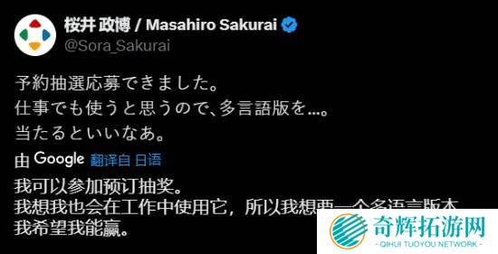 知名游戏制作人 樱井政博 今日发布推文,表示自己有资格参与Switch 2的预购申请,因为工作需求,所以樱井更想要一个多语言版本的Switch 2。对此不少网友都表示了惊讶:连樱井政博都得和所有玩家一