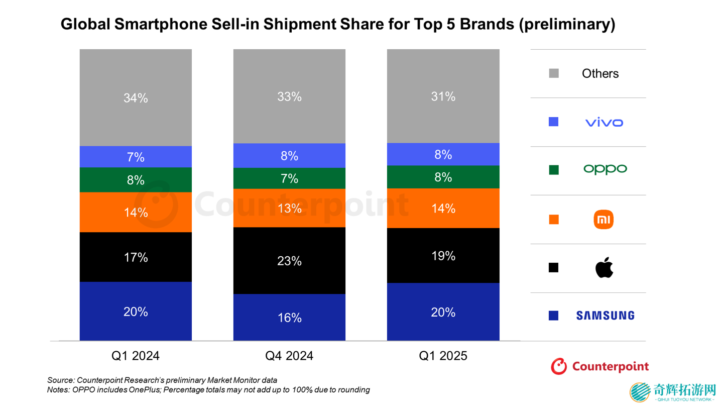 本站 4 月 17 日消息,市场调查机构 Counterpoint Research 昨日(4 月 16 日)发布博文,报道称 2025 年第 1 季度全球智能手机出货量同比增长 3%,中国、拉丁美洲