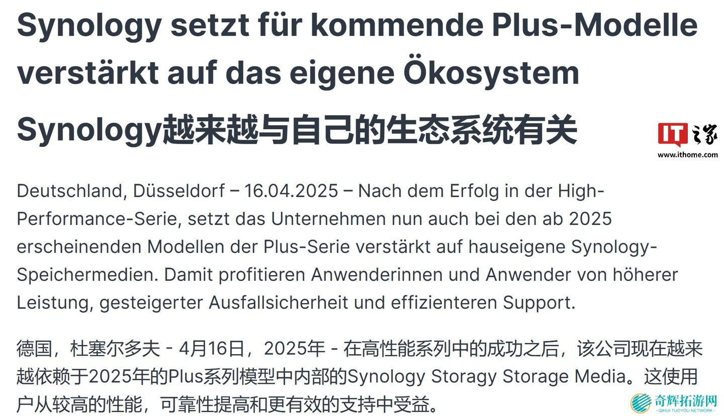 本站 4 月 17 日消息,群晖(Synology)德国官网发布博文,为了长期致力于打造围绕 NAS 系统的自有生态,宣布在 2025 年推出的 Plus 系列机型中,限制用户使用非官方或未经认证硬盘