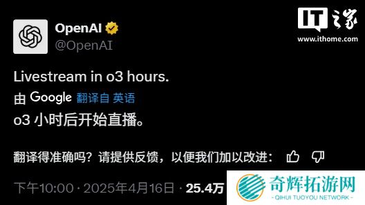 感谢本站网友 GreatMOLA 的线索投递! 本站 4 月 16 日消息,OpenAI 今日晚间 10 点发布预告,将在o3 小时后进行直播。从官方特别
