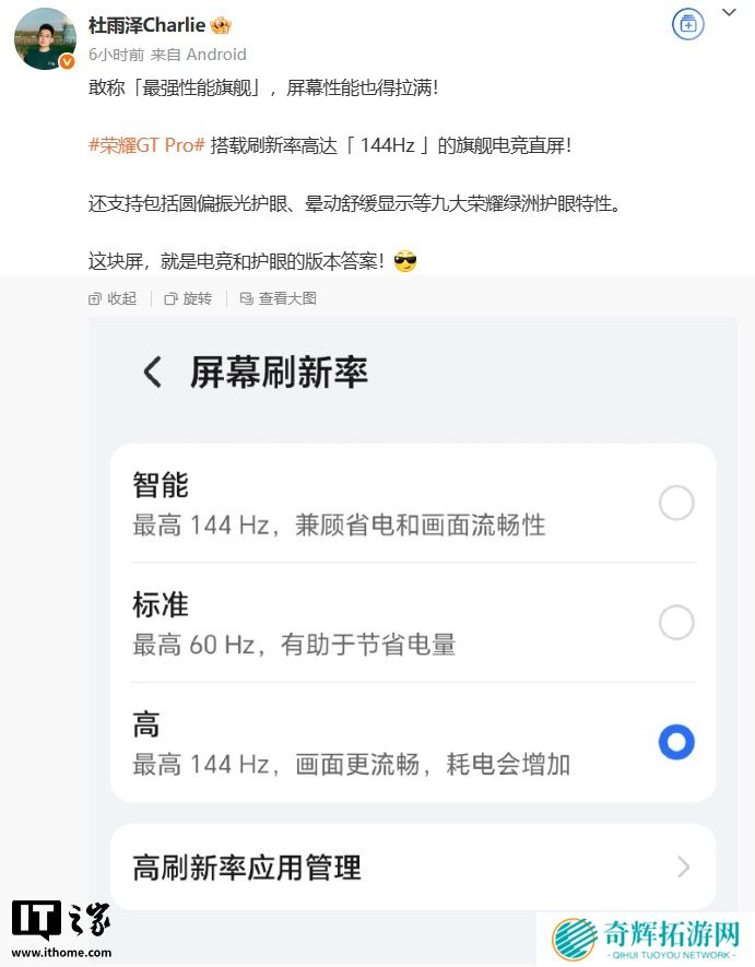 本站 4 月 15 日消息,荣耀 GT 系列产品经理@杜雨泽Charlie 今日发文透露,荣耀 GT Pro 手机搭载 144Hz 高刷旗舰电竞直屏,支持包括圆偏振光护眼、晕动舒缓显示等九大荣耀绿洲护